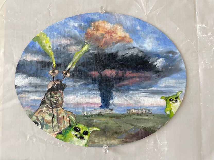 Fellalien Activity, 9.5 x 12 inches, oil on canvas board, commemorative of Sevastopol oil depot being blown April 29, 2023
