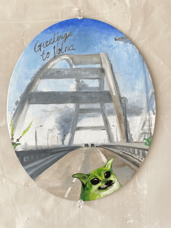 Greeting to Volna, 9.5 x 12 inches, oil on canvas board, commemorative of fuel depot in Volna being blown May 3,2023